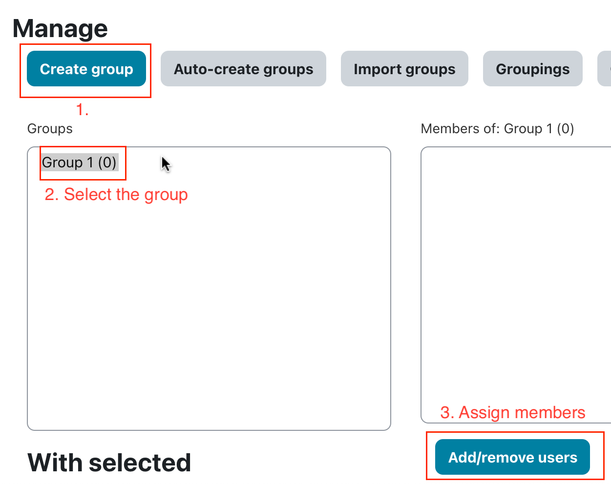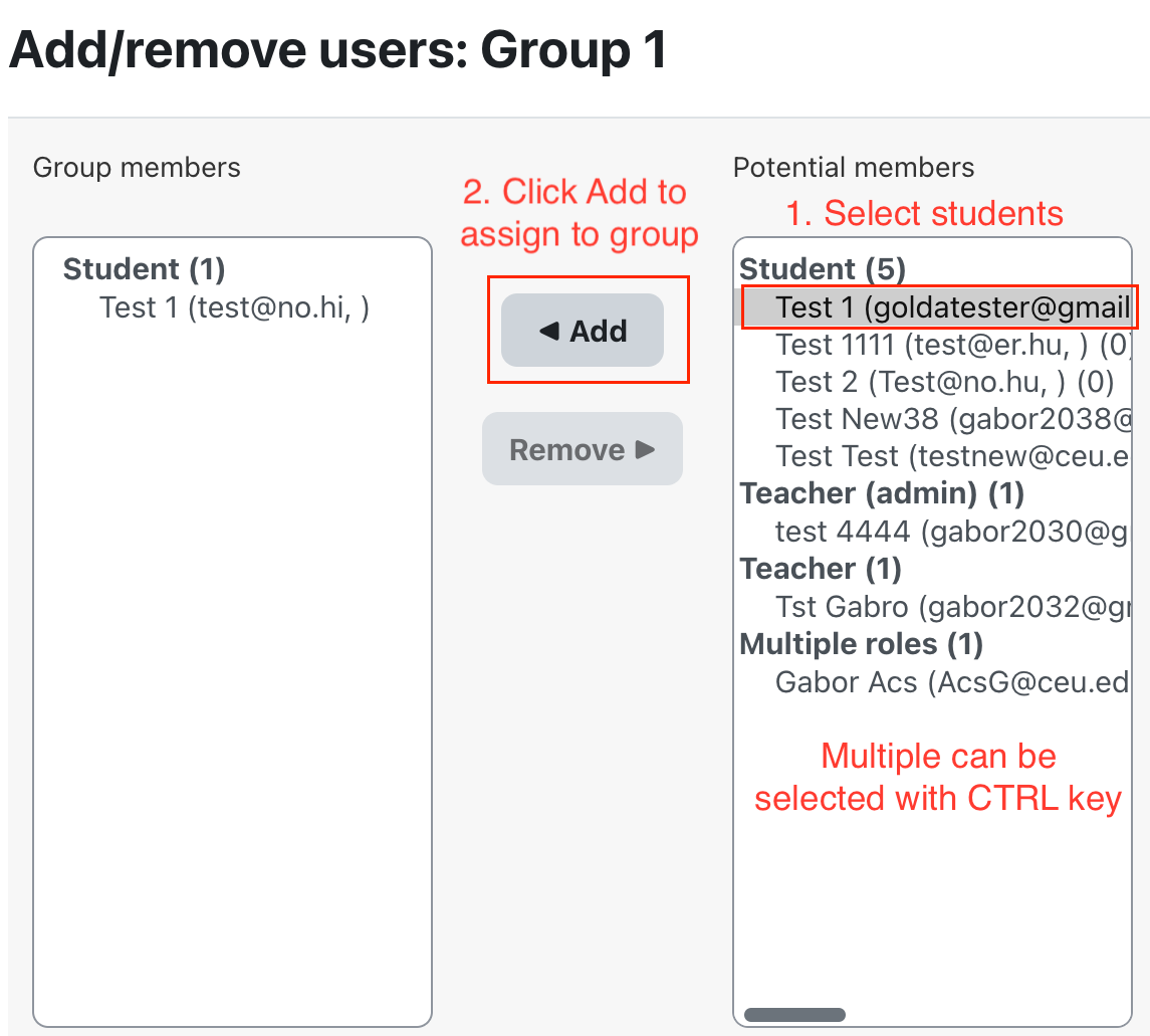 The other fields are optional, most of the time can be ignored. The new group then appears in the left-hand column.Alternatively you can use Auto-create groups. This option can create multiple groups and assign students randomly.