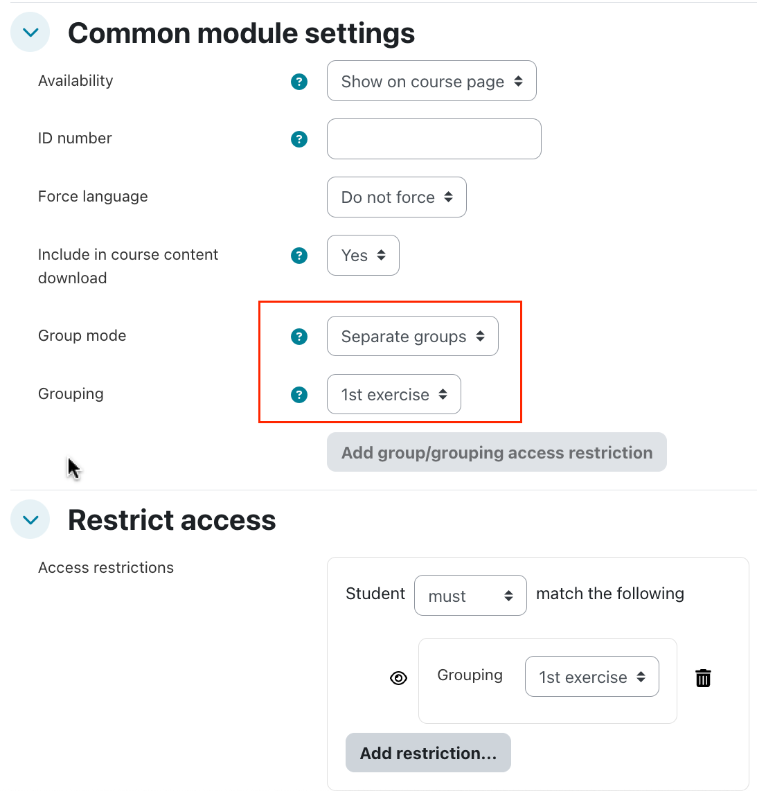 - Scroll down and open Common module settings and set Group mode to separate groups as a prerequisite. Then select the appropriate grouping, then click Save and return to course.